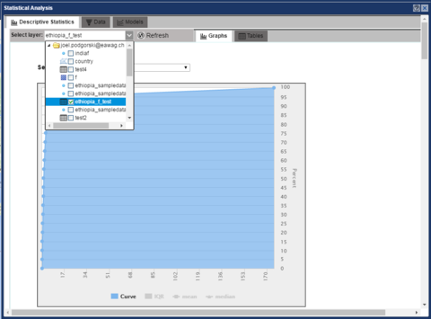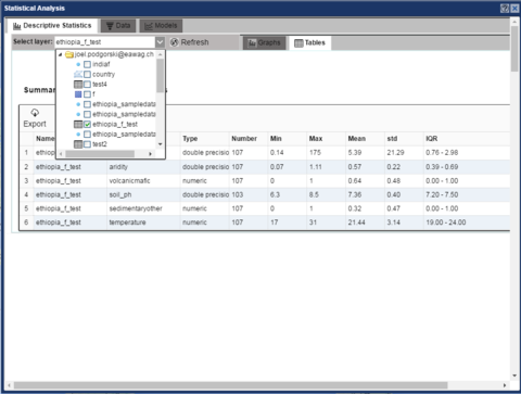 To view basic model statistics, select the model and go to 'Descriptive Statistics'. You can view basic statistics for each variable either as a graph (Select an attribute) or as a table (Figure 1).