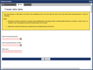 To create a new data table, click Add (Figure 1). Select the layer containing the data to be modeled, choose the target variable (Figure 3a) and specify a table name. The target variable will be the dependent variable of your model. The independent (predictor) variables will later get added to the table. Click OK to complete the process.