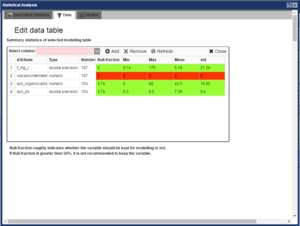To edit a table, select it in the Data tab and click Edit (Figure 2). This will open a summary of the variables in the table to be included in your model (Figure 3b). Here you can add the independent variables to be used as predictors of the occurrence of groundwater contamination in your model. First, click on the drop-down menu Select column to display the list of all available layers. Once you have selected a variable, click Add. Some variables are more suitable than others, for example, due to their distribution of values. It is strongly recommended to remove any unsuitable variables (highlighted in red) before running your model. The color coding is defined as follows:
