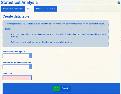 Before creating a statistical model, a modelling table must be prepared that includes all of the data to be used in modelling. This is done within the Data tab. Previously created modelling tables are also listed here.
