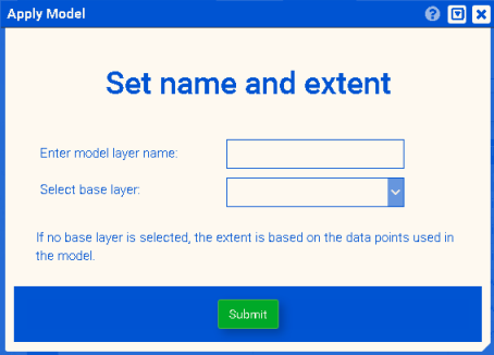 To generate a probability map based on a certain model, select the model and click 'Apply Model'. Then provide a name and select a layer to be used for calculating extent and resolution of probability map. You can also leave the latter option blank, then the model extent will be calculated based on the measurement points you provided.