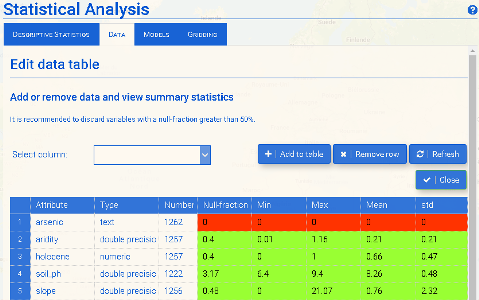 To edit a table, select it in the Data tab and click Edit (Figure 2). This will open a summary of the variables in the table to be included in your model (Figure 3b). Here you can add the independent variables to be used as predictors of the occurrence of groundwater contamination in your model. First, click on the drop-down menu Select column to display the list of all available layers. Once you have selected a variable, click Add. Some variables are more suitable than others, for example, due to their distribution of values. It is strongly recommended to remove any unsuitable variables (highlighted in red) before running your model. The color coding is defined as follows: