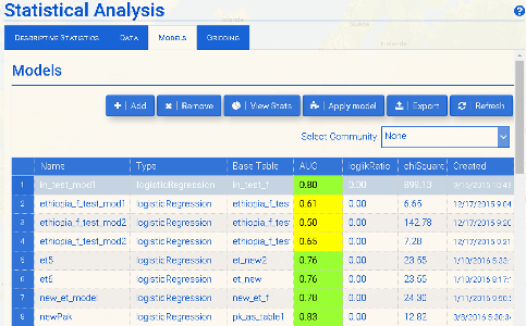 In the Models tab (Figure 4), you can add a new model (Add), view the statistics of an existing model table (View Stats), apply a model (Apply Model) or export the results of a model (Export). The (Refresh) button is available to update the list of models.